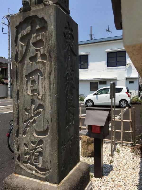 日光街道の古河宿道標が、二丁目通りと鍛冶町通りの交差点に、南面して建てられています。文久元年(1861)の常夜灯形式の道標で、古河市指定有形民俗文化財です。